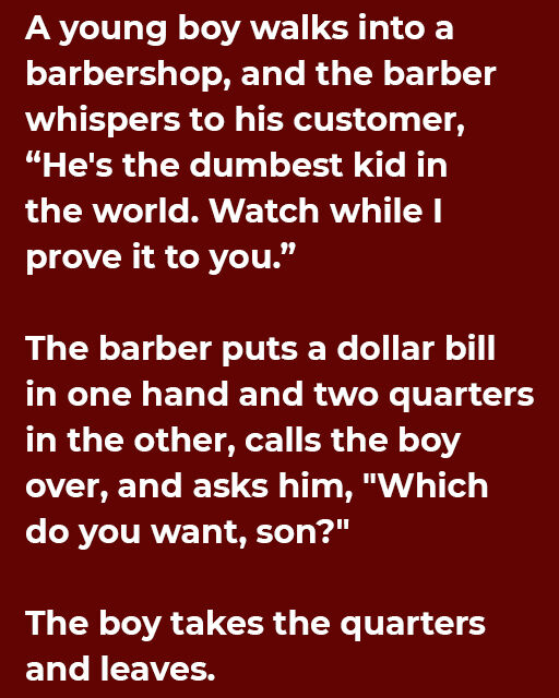 The barber puts a dollar bill in one hand and two quarters in the other, calls the boy over, and asks him, “Which do you want, son?” The boy takes the quarters and leaves.