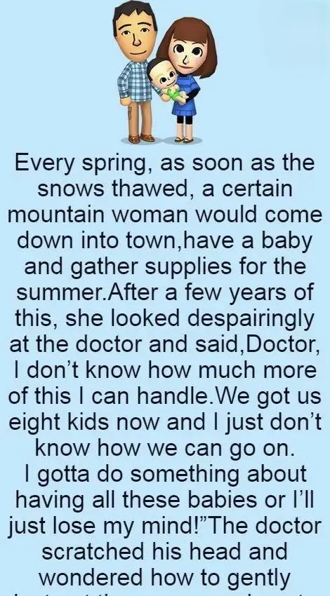 Every spring, as soon as the snows thawed, a certain mountain woman would come down into town, have a baby and gather supplies for the summer. After a few years of this, she looked despairingly at the doctor and said, Doctor, I don’t know how much more of this I can handle. We got us eight kids now and I just don’t know how we can go on. I gotta do something about having all these babies or l’ll just lose my mind…