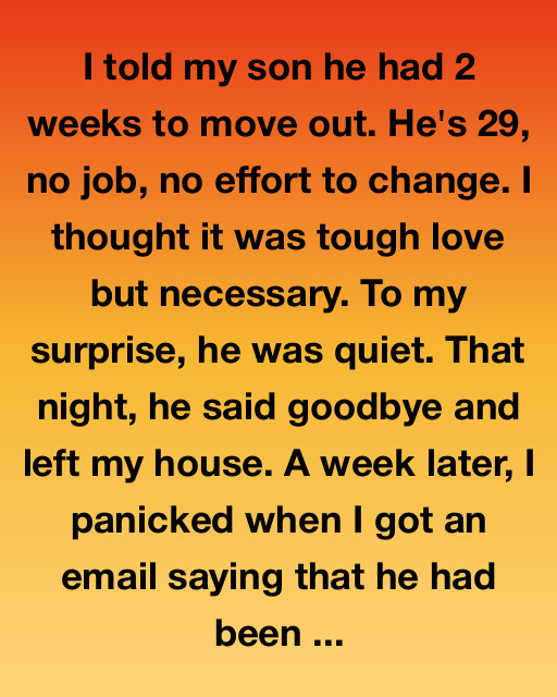 I told my 29-year-old son he had two weeks to move out. No job, no effort—I thought tough love was the only way. He left quietly. A week later, I got a call from a woman named Grace: he’d been found unconscious at a train station. Severe dehydration. No food for days. My heart sank.